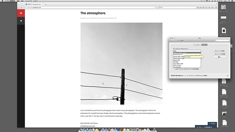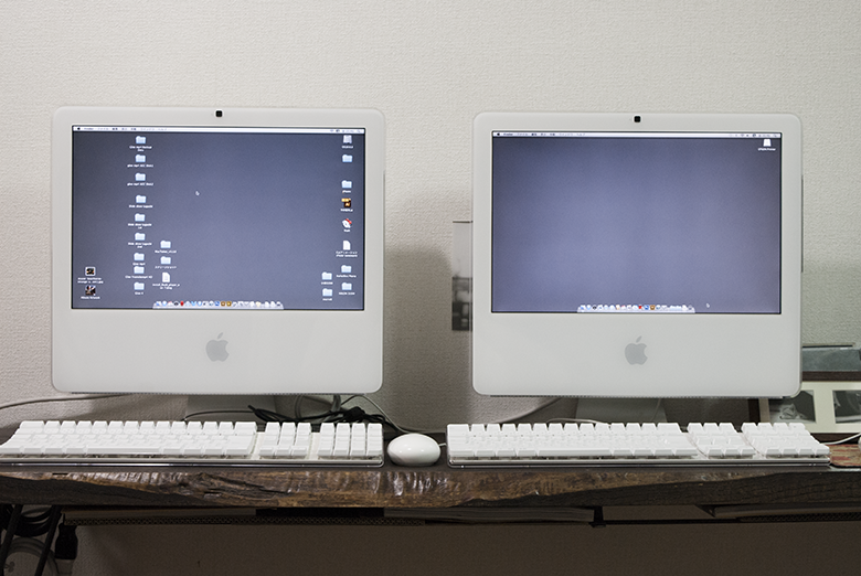 キャリブレーション前の画像です。iMacを2台並べてみると色の違いに驚きました。左が最近まで写真を現像していたiMacでこれにシネマディスプレイを繋げていました。右のiMacは購入から何も調整していない状態です。(どちらも壁紙は同色)