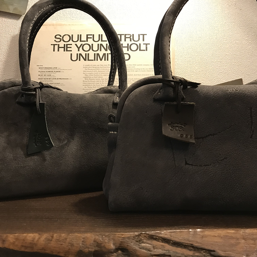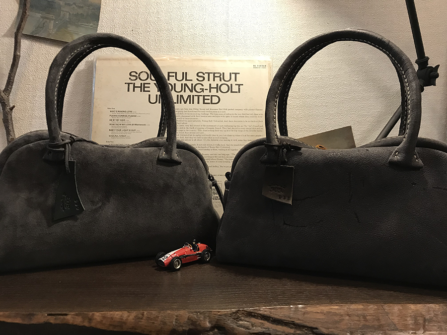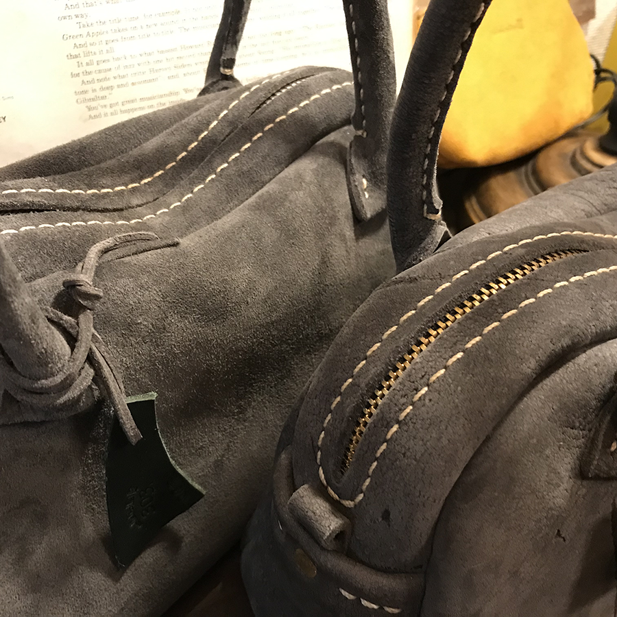 ↓ スエード面が表のバッグと吟面が表のバッグです。