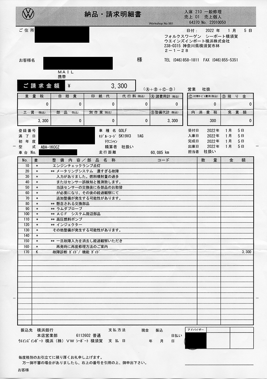 大晦日にエンジンチェックランプ点灯したのでディーラーには1月5日に恐る恐る運転しながらの持ち込みでした。