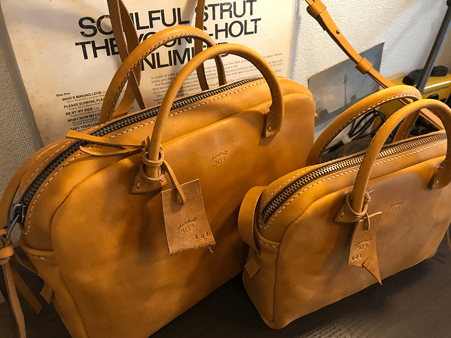 革が硬めのサッビアレザー(山吹色)を使用します。