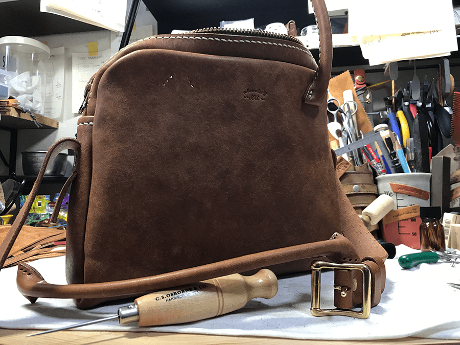 革表面を真鍮製のブラシで擦り「革にわずかに残った細かな毛を毛羽立たせています」