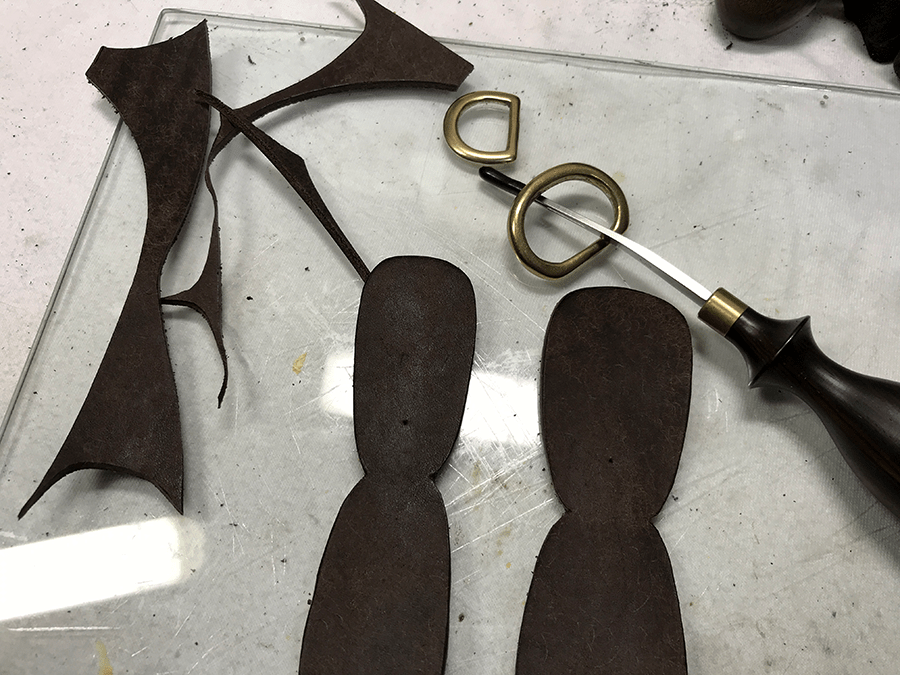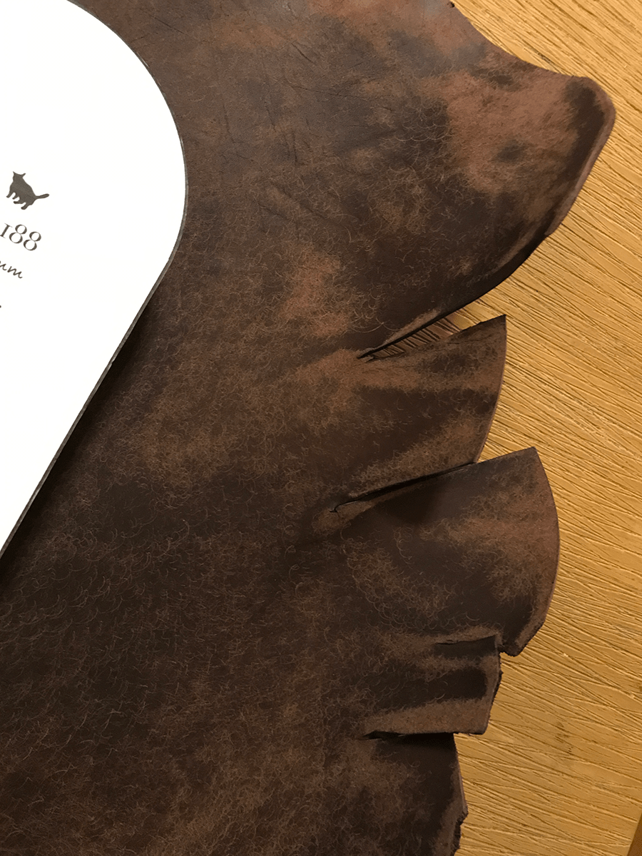 ↓ とりあえずで使える革ではないのに>.<” プエブロレザー/カスターニョのハギレで切り出します。