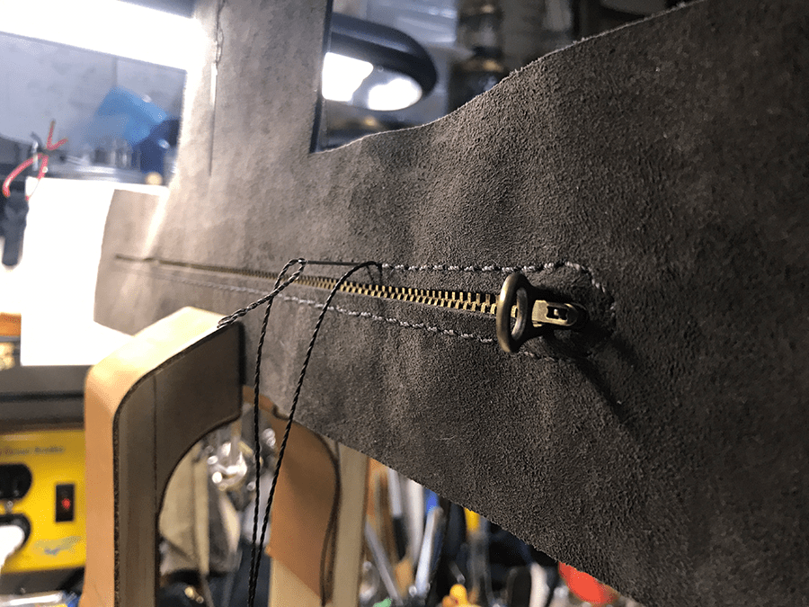 ジッパーを取り付けます。真鍮製のWALDES#5を付けてあります。 本番のストーン色はTALONのシルバー、大きめ#8を付けます! 自分用にストックしてある希少品なダブルジッパーです。