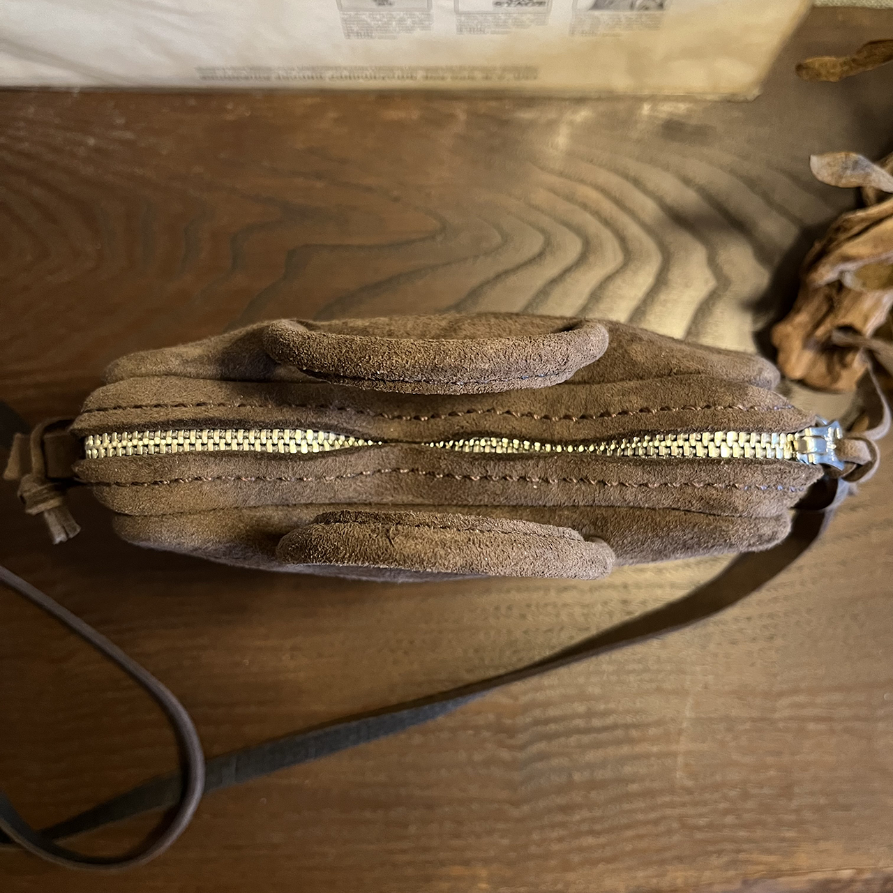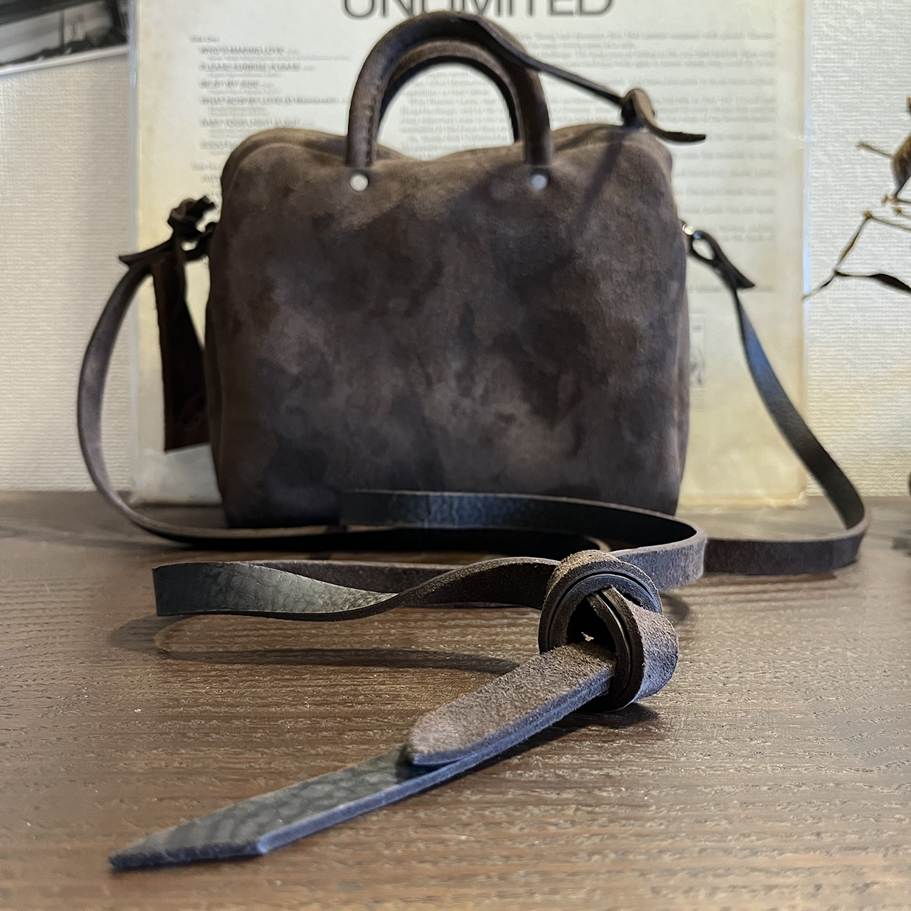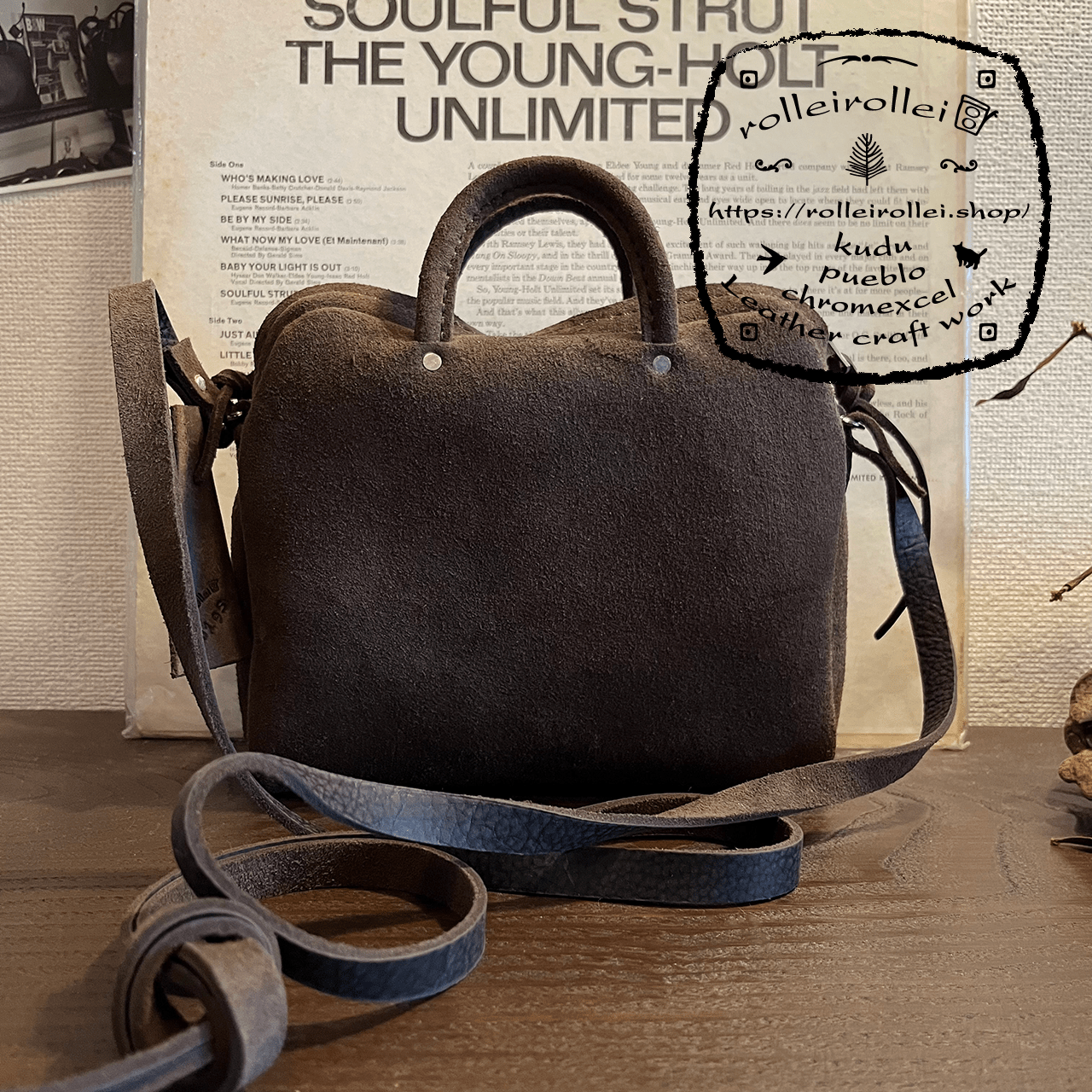 肩にかけるショルダーもkudu革です。 結んで長さ調整するようにしました。 なぜかって? その方が可愛いのかな♪、、、と思うので。 kudu革は丸革(1頭の状態)で購入してもさほど大きくない動物ですのでショルダー(肩ベルト)の十分な長さが切り出せません。 そんな理由から肩位置にバックルが取り付く場合が多く「結ぶ」という選択をしてます。