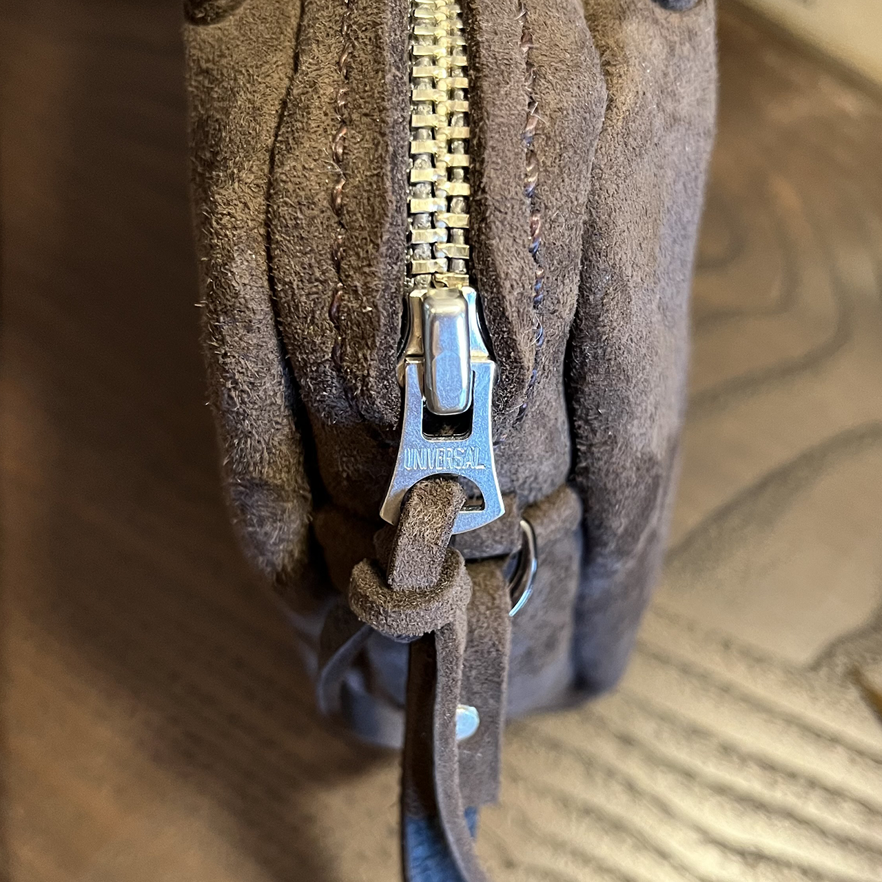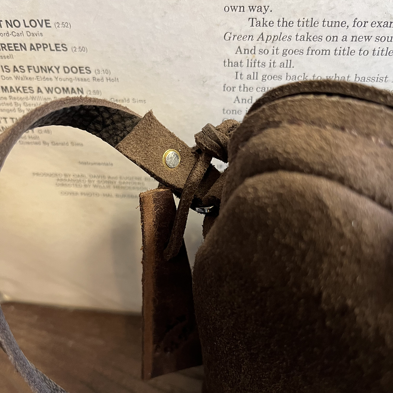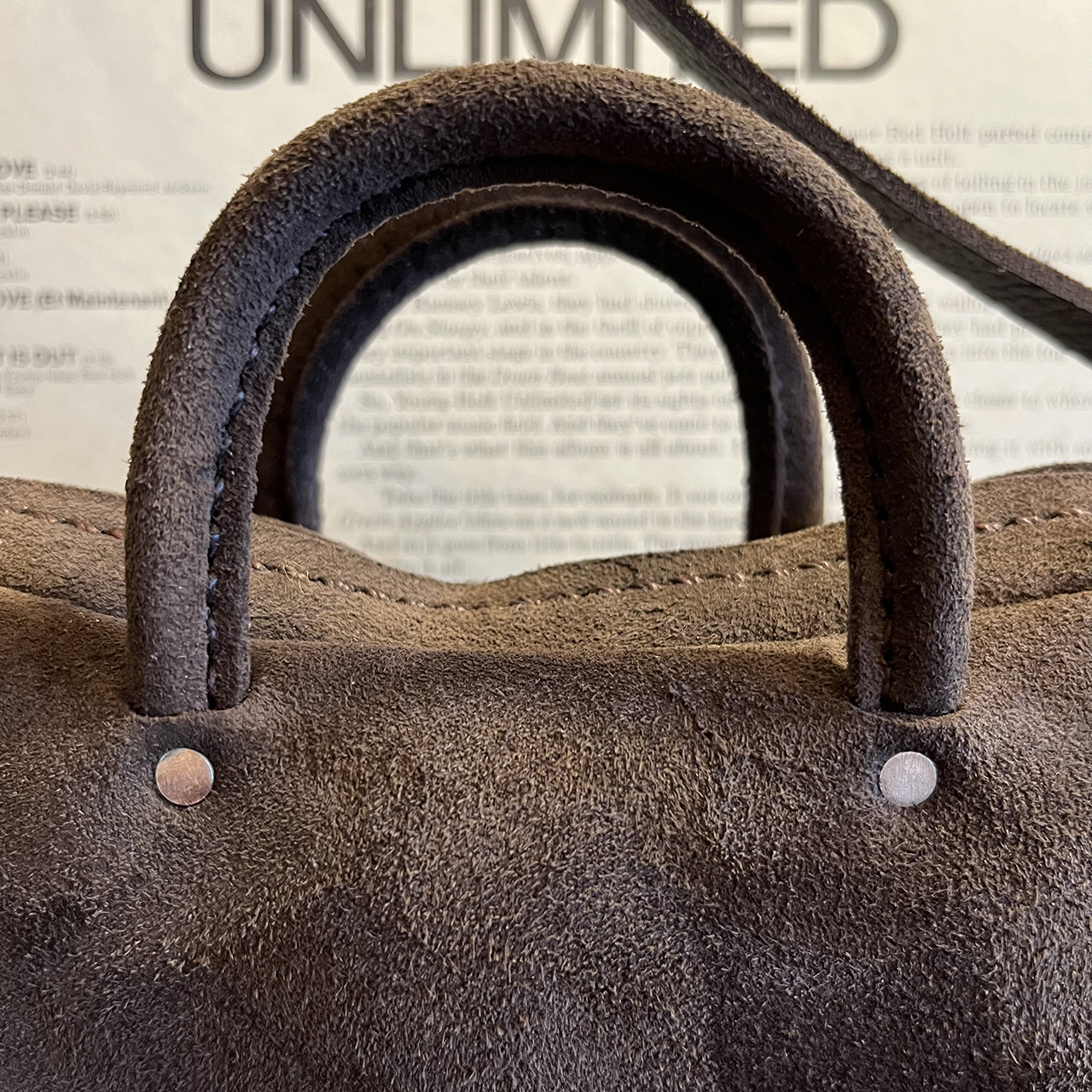 肩にかけるショルダーもkudu革です。 結んで長さ調整するようにしました。 なぜかって? その方が可愛いのかな♪、、、と思うので。 kudu革は丸革(1頭の状態)で購入してもさほど大きくない動物ですのでショルダー(肩ベルト)の十分な長さが切り出せません。 そんな理由から肩位置にバックルが取り付く場合が多く「結ぶ」という選択をしてます。