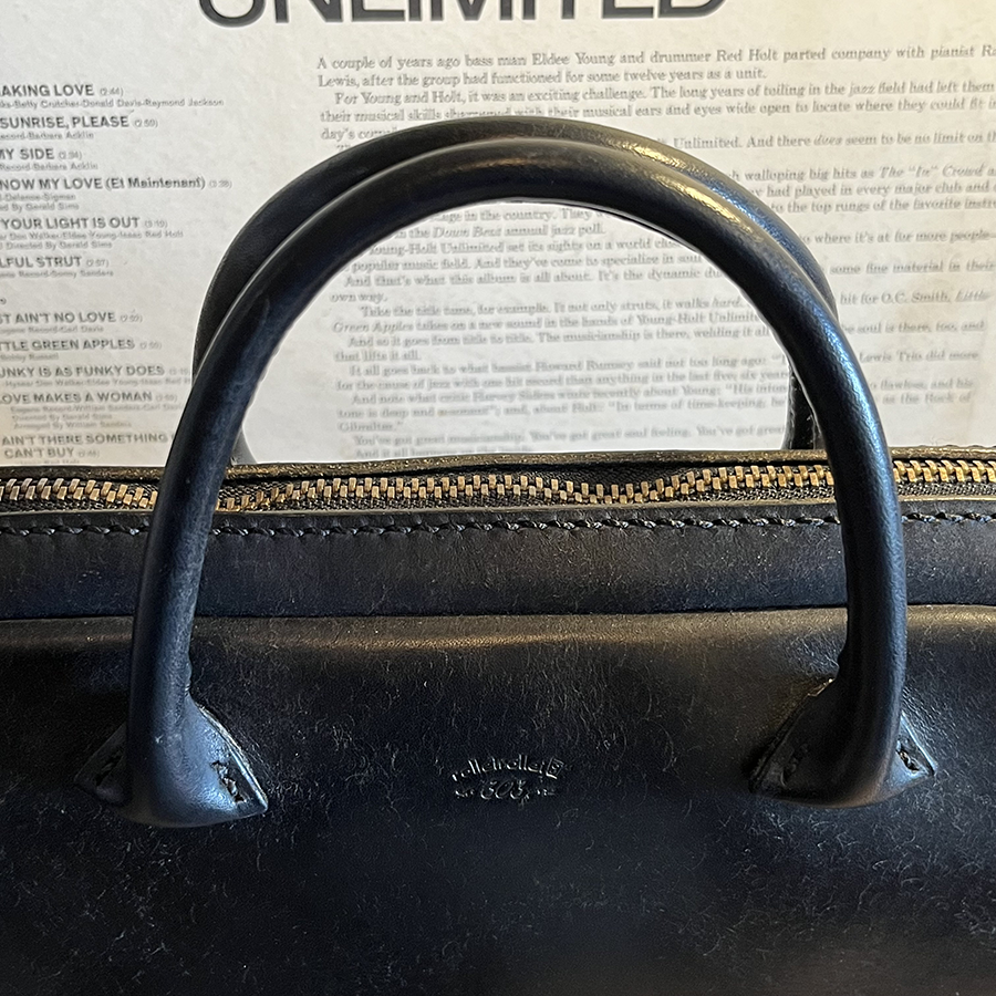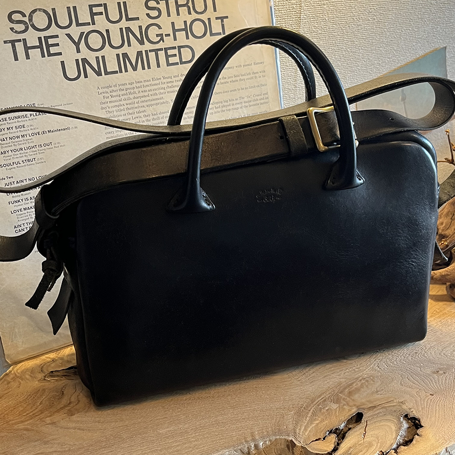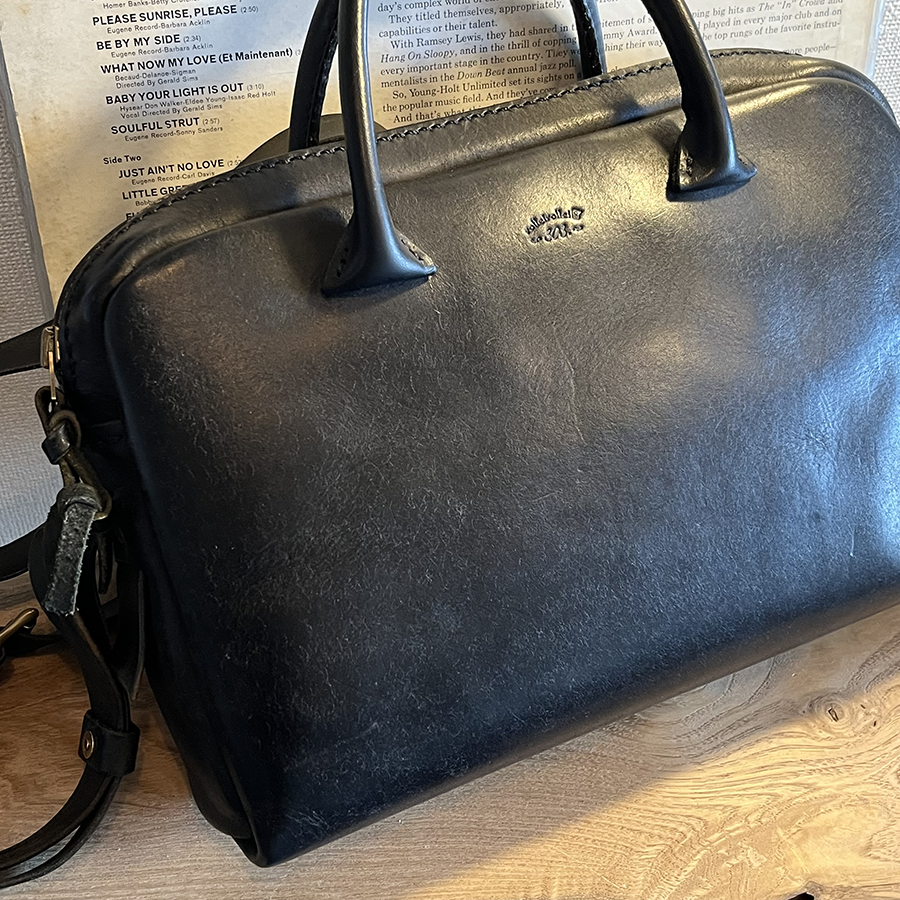 ↓ こちらは僕の持つプエブロレザーのブラックです。ブログでも紹介してますが2022年11月に仕上げたバッグで少し幅広にしてあります。まだ経年変化の途中な印象ですが艶が出てきてます。持ち方や着る物との擦れかたで持つ人特有の経年変化をしていきます。