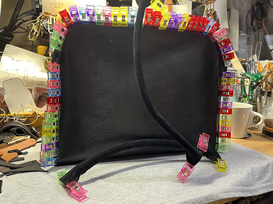 なぜ手で塗ってるの? と聞かれることがあります。 ひとつは革を薄くすることなく原厚のままで仕上げたいので革と革が貼り合わさってとても厚みがある箇所が多いこと。 もうひとつの理由として縫い上げてからひっくり返すバッグを作っているということ。このひっくり返すことに手縫いが大切な理由となります。 バッグでもポーチでもミシン目が見えているアイテムを見かけたことがありませんか? もしくは使っていくうちに縫い目が開いてきた、、、なんてこと。 僕の作るバッグはkudu革にしてもプエブロレザー にしても厚みのある革をそのまま使用してモッチリとした仕上がりになるようにしてます。 その仕上がりにするには手縫いで締め上げなければならない箇所が数カ所あります。ひっくり返す作業もとても大変です。 特にマチの所や上部のアール(角)部分は大切に大切に作業してます。 一点物と説明に入れてますが、このひっくり返す作業でフォルムが決まります。kudu革ではそれほどカタチに違いが出ませんがプエブロレザーの作品は「なんとも言えない独特なフォルム♪」となります。