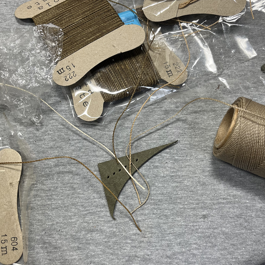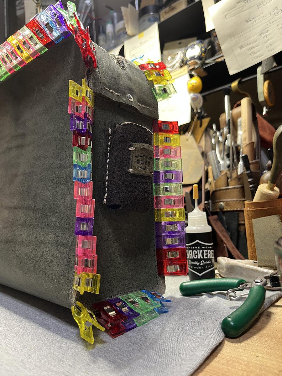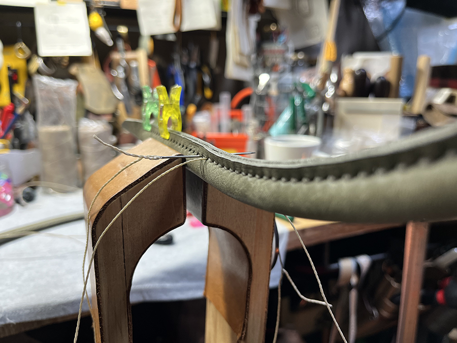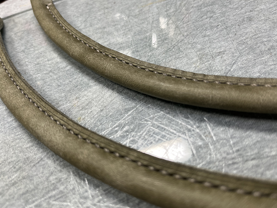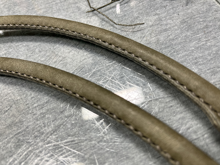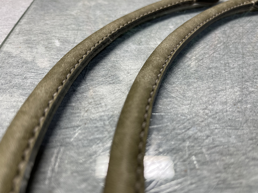 この色グリージオは少し難しい色かも。 縫い終わってコバを磨いたらブラウンになる?