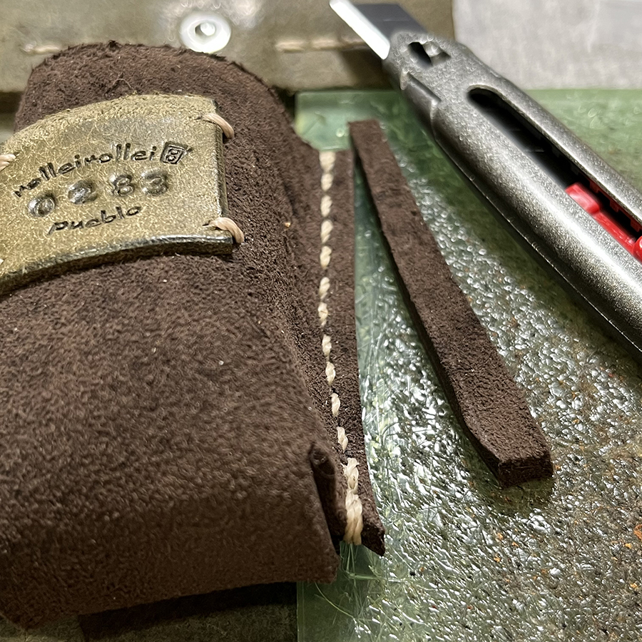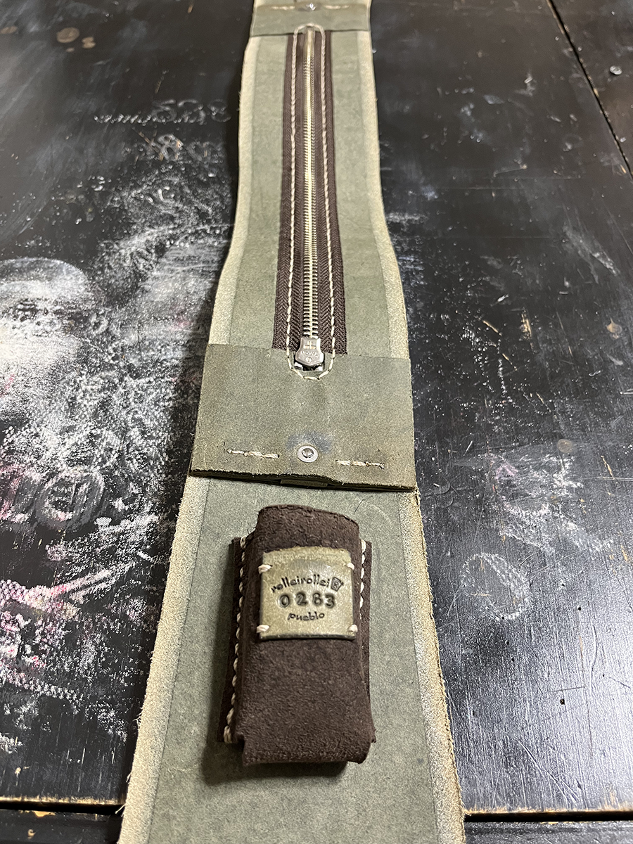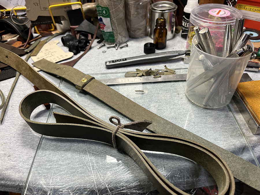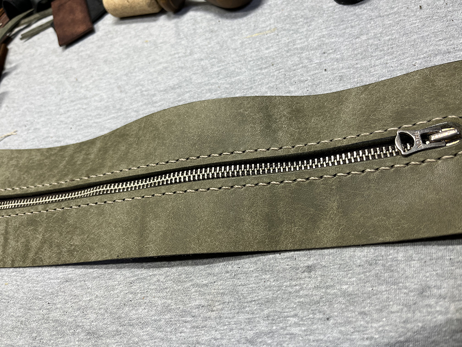 次の作業はジーパーにサイドパーツを、そしてショルダーベルトへと繋げていく。 丸革のいちばん長い辺から切り出さないと長さが足りないので仕方なく入ってしまう焼け部分。 ショルダーベルトのシッポの長さ次第。どうする? どちらにしても焼けは見えちゃうだろうな。 あのシミ、、、なんだろ?