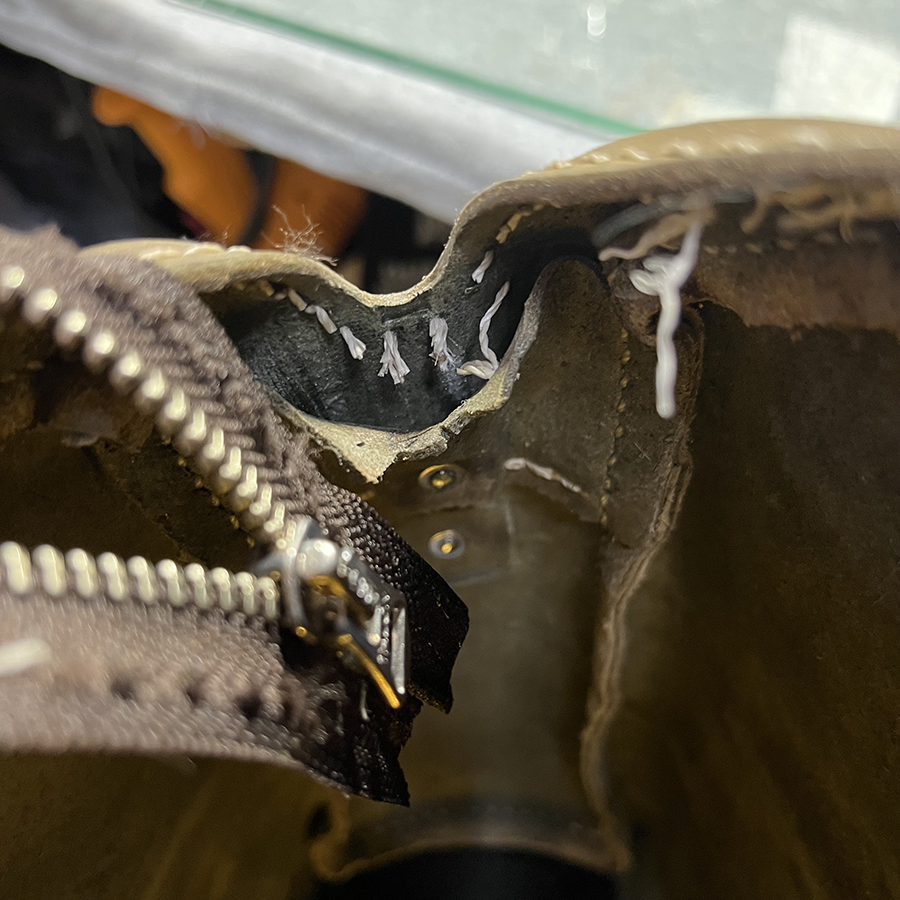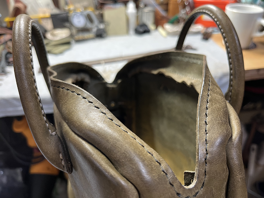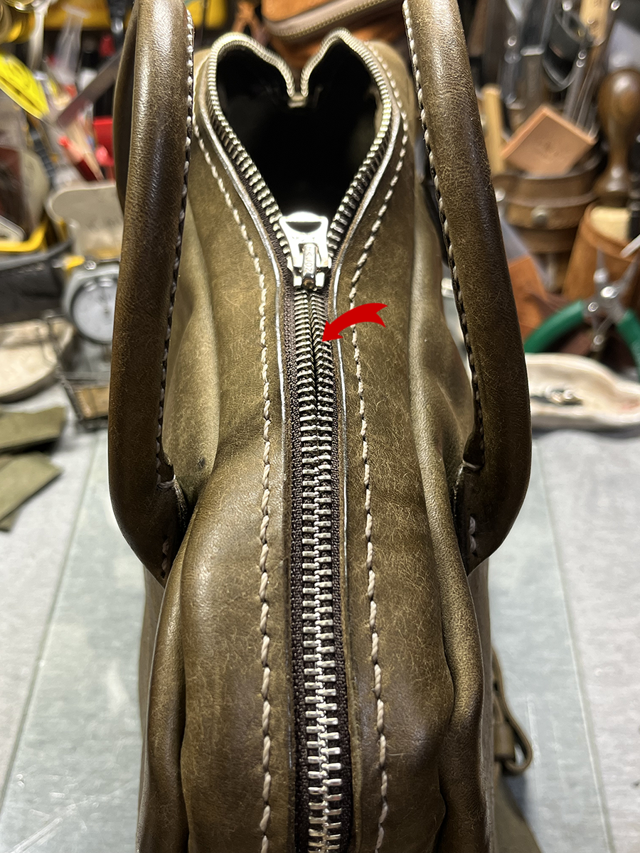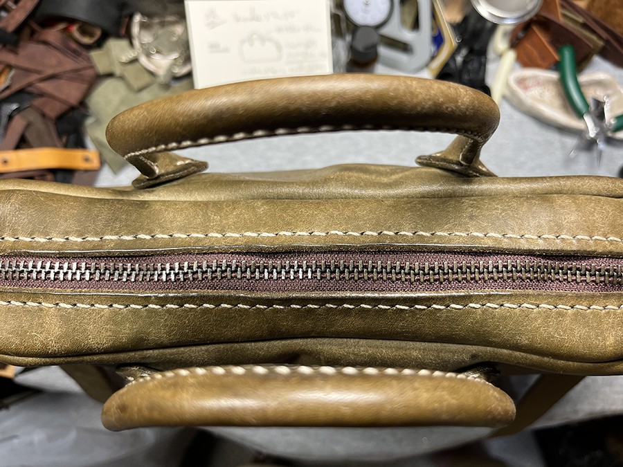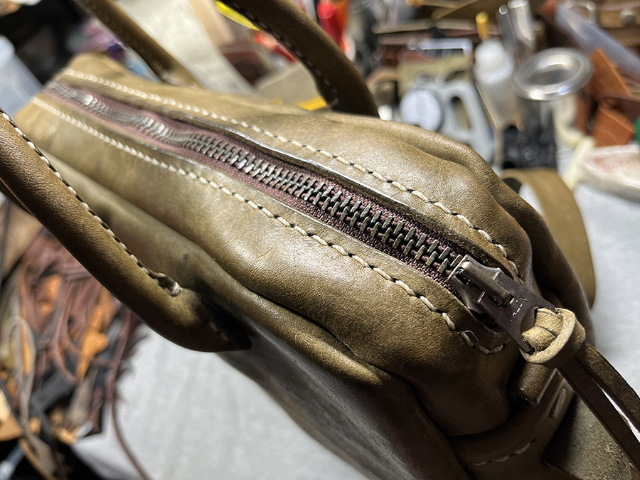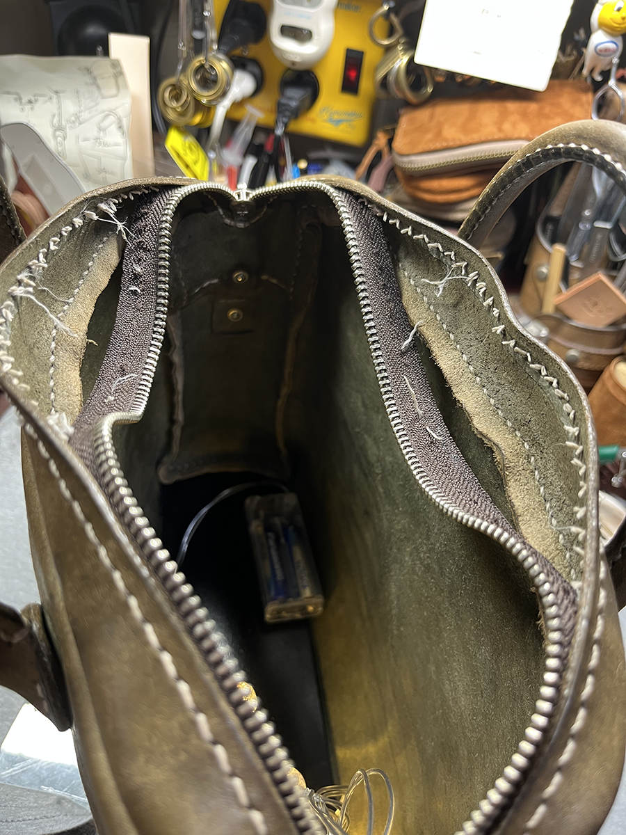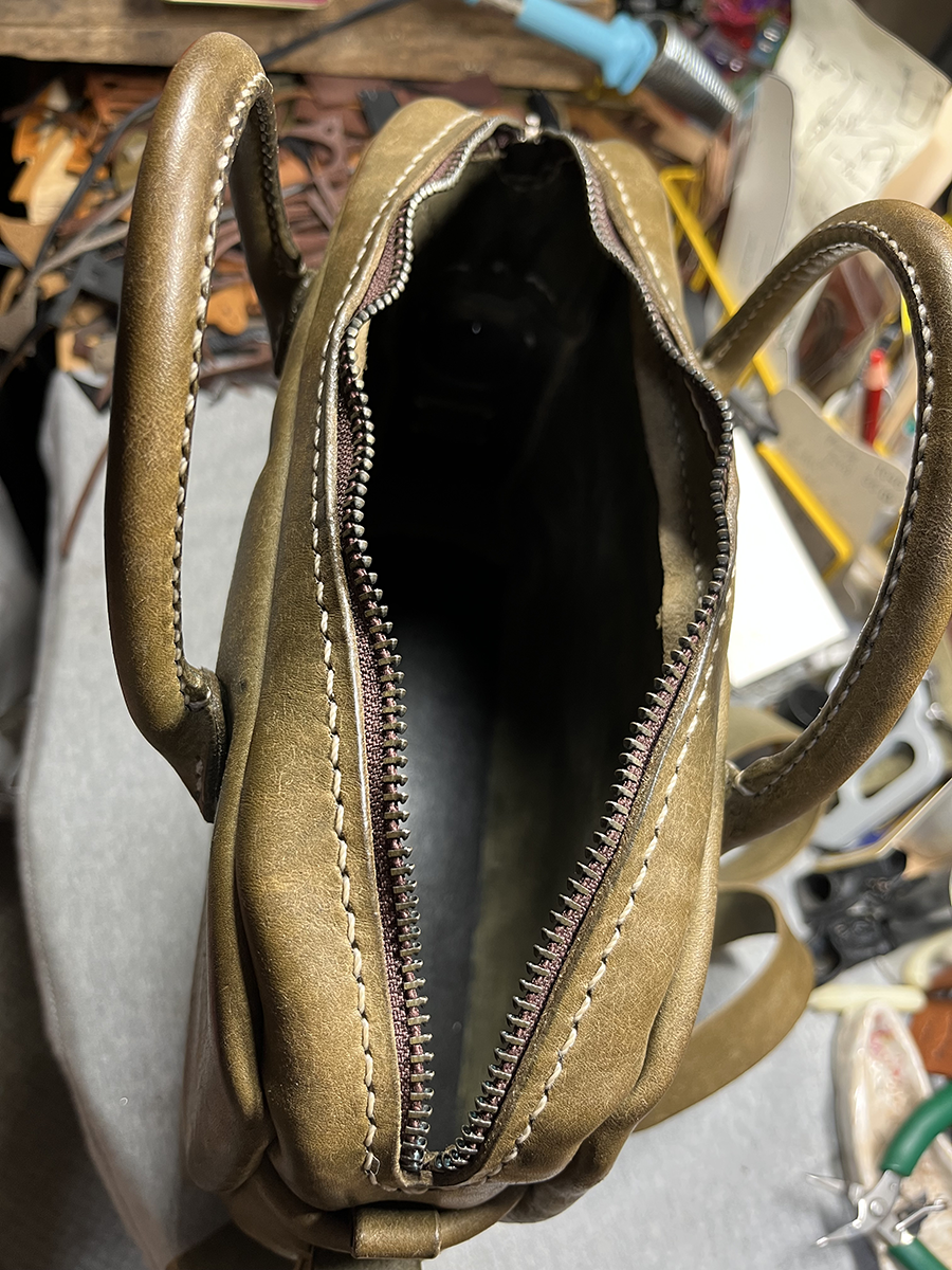 なんとか縫いました! やはりジッパーの両端はバッグのカタチのまま付け替えるなんて無謀です。 よく縫えたね、、、。 まして、ジッパーの両端を見せたくないので内側を革で隠し処理をしてあります。表の縫い穴と裏の縫い穴に1mmのズレもなく貼り合わせて針を通す! お上手♪