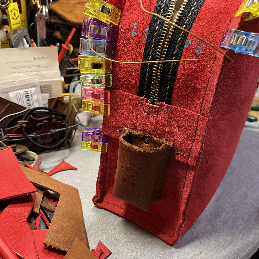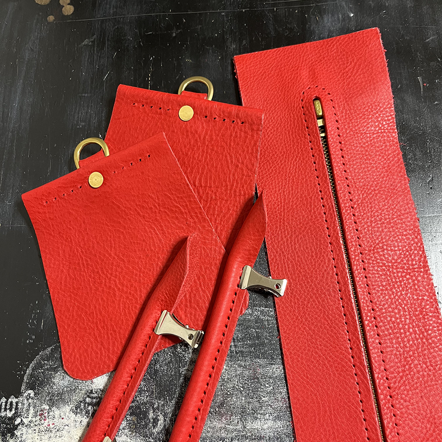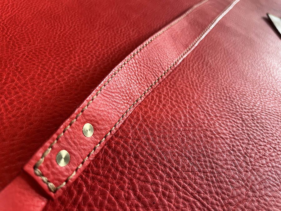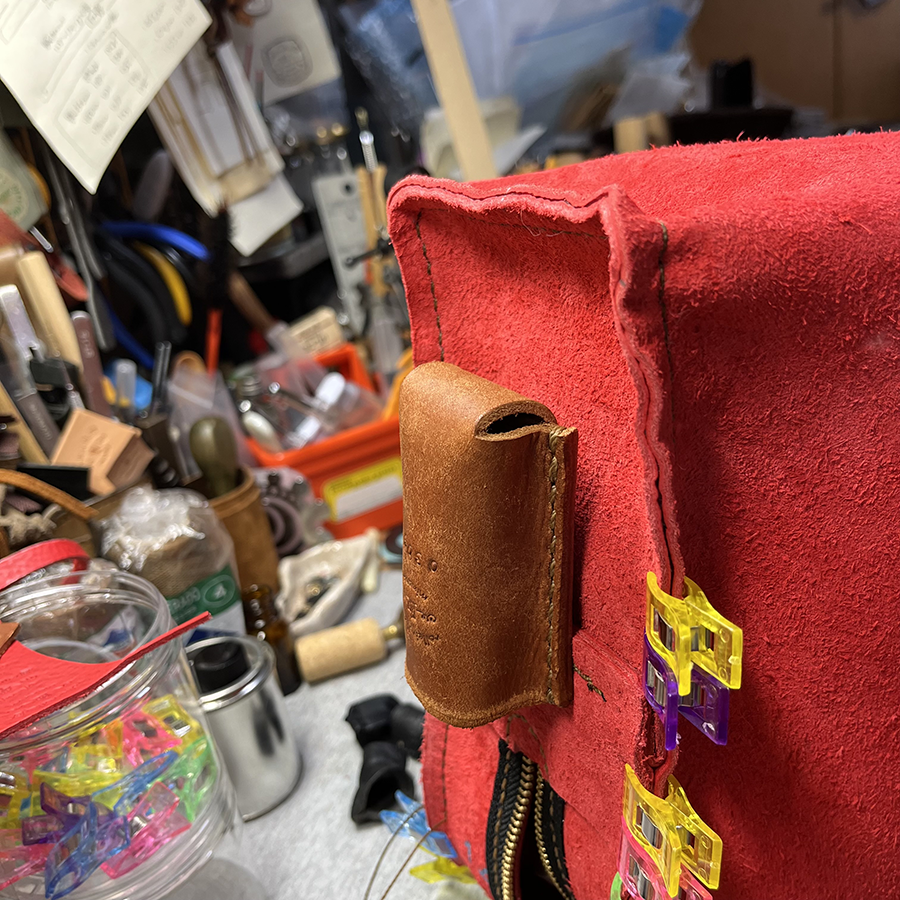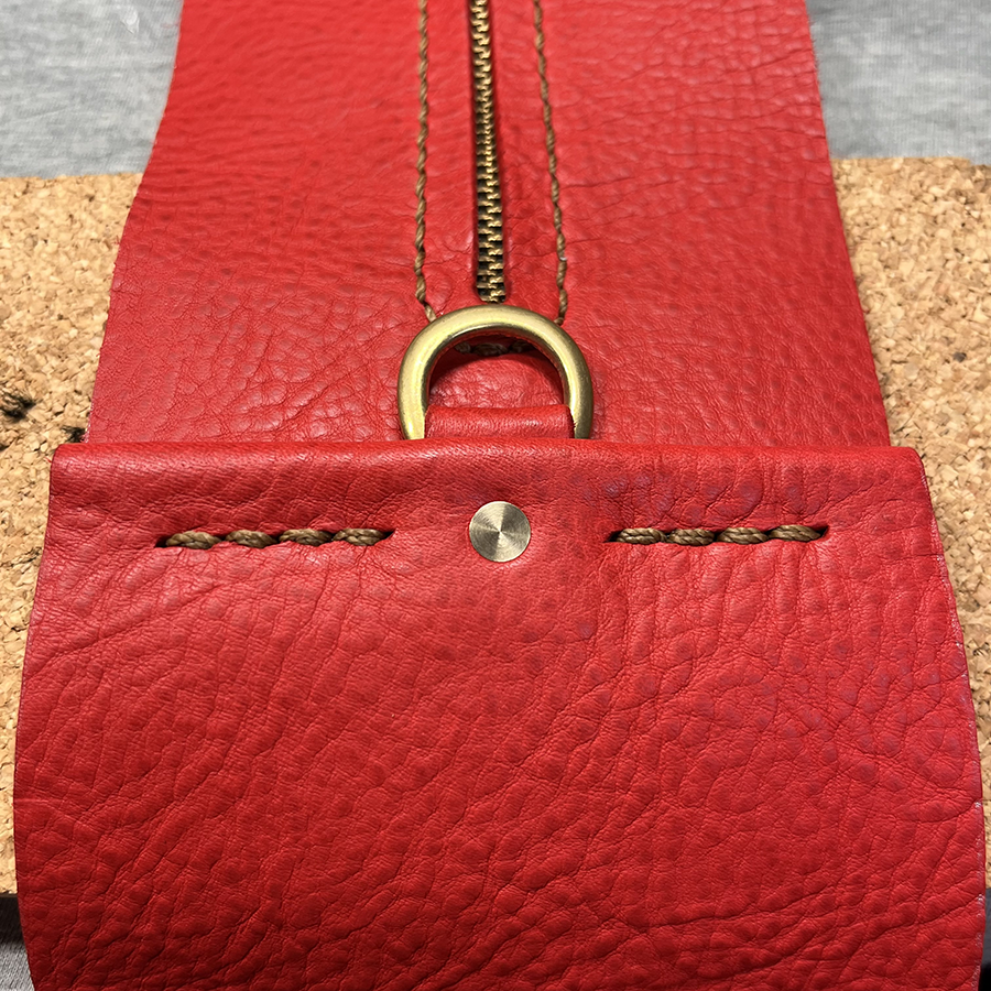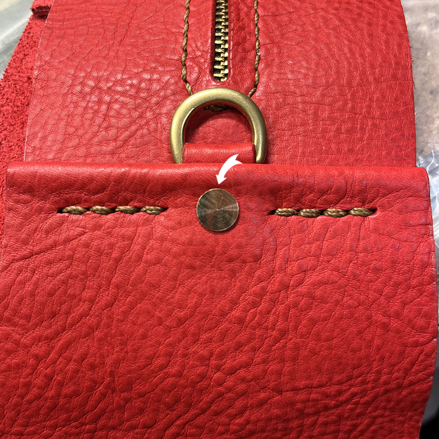 ジッパーパーツとサイドパーツを貼り合わせてギュ〜っと縫い付けた後、リベットでDカンが付いた革も合わせて3パーツを固定。 バッグの重さがかかる大切な部分。 予定していた大きめリベットを通したときに「矢印の部分が食い込むな」と。 小さなリベットに変更!