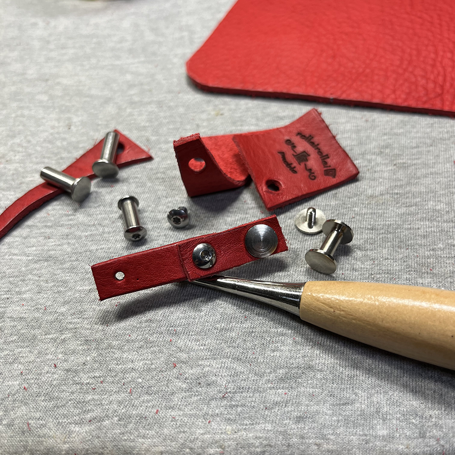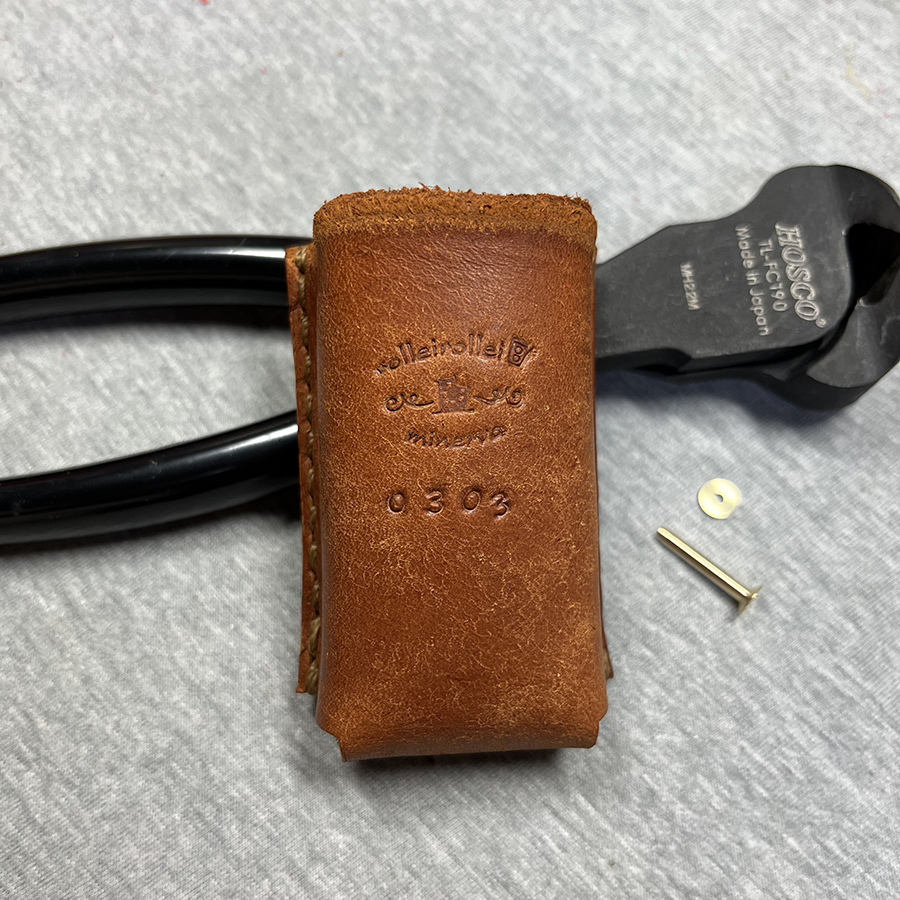 僕が使用するリベットのほとんどは購入店のオリジナルリベット(真鍮製)で1個250円ほどの価格。ショルダーベルトだけで4個使ってます。今回のバッグには初めて大きいリベットを打ってみます。ちなみに一個350円ほどします。「どんなリベットでも同じじゃない?」そう思う人もいるでしょうね〜。