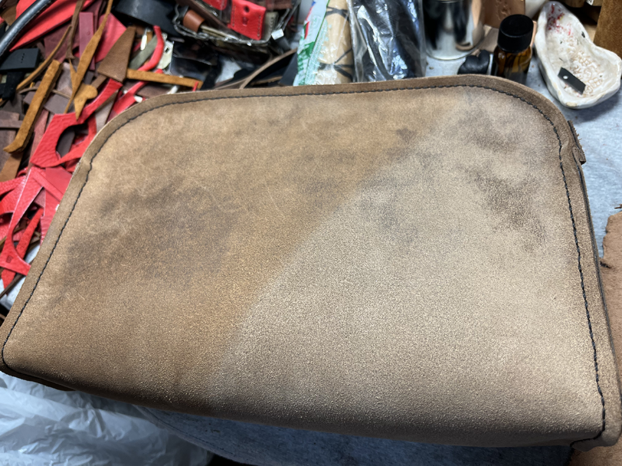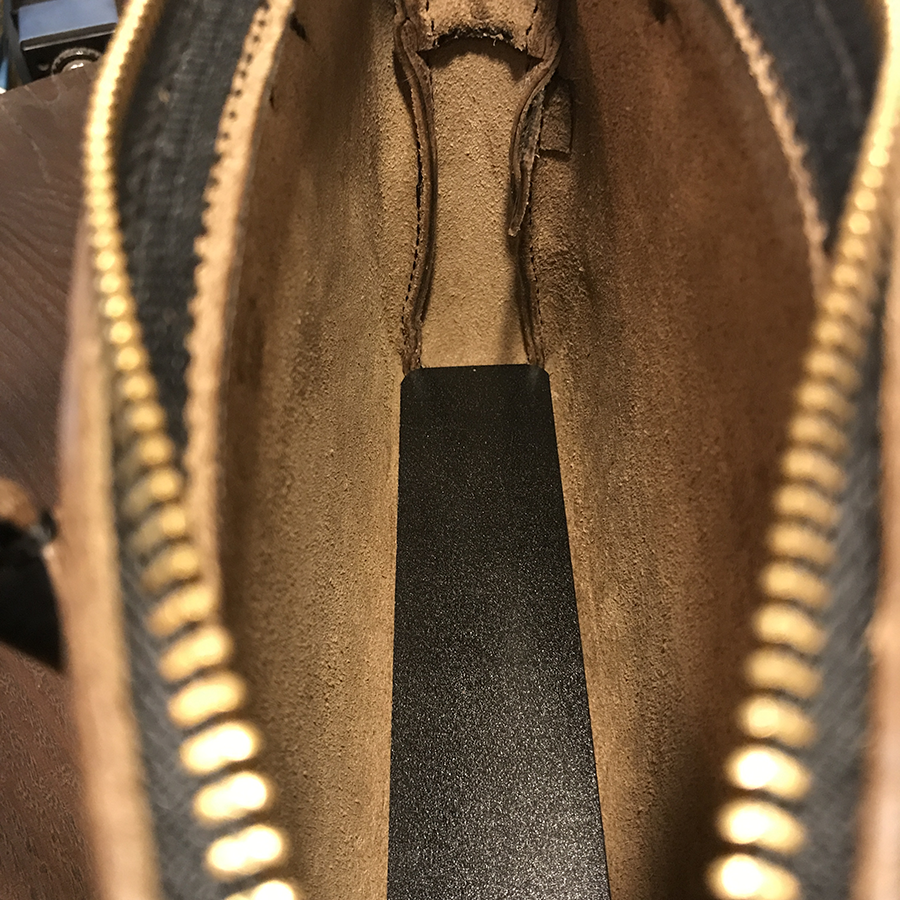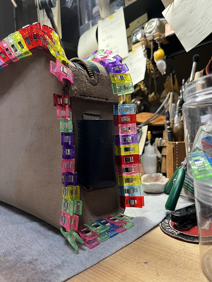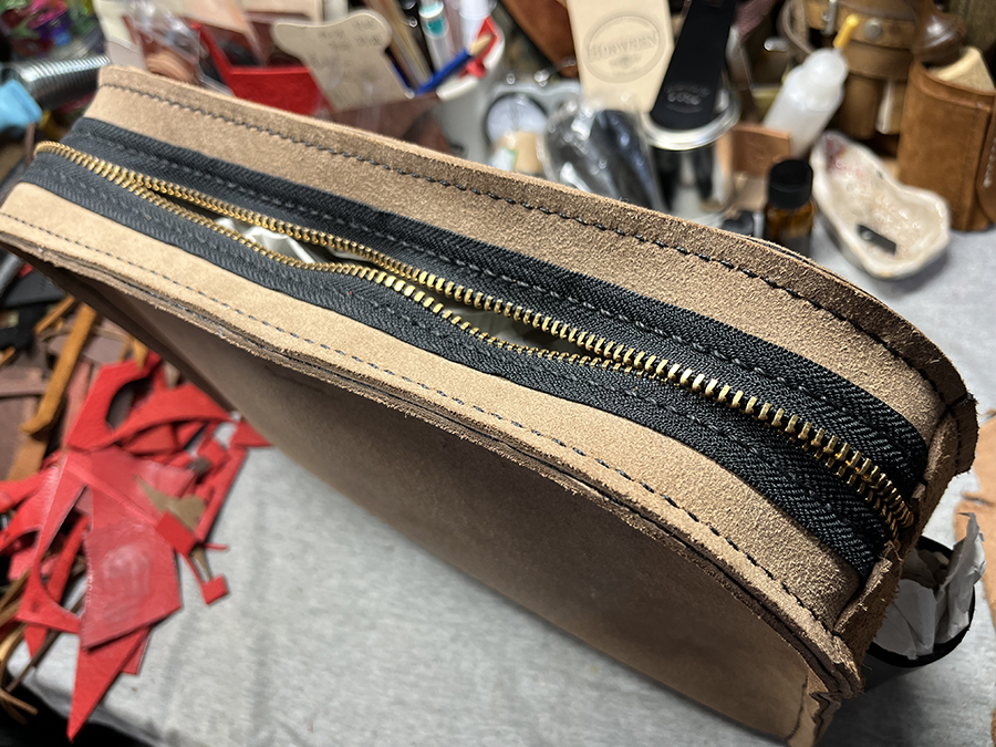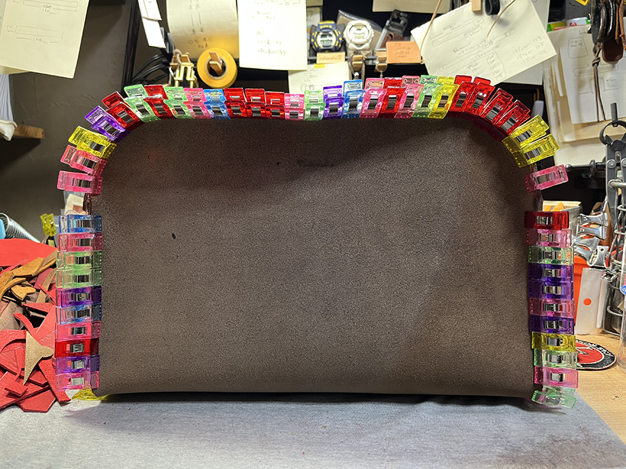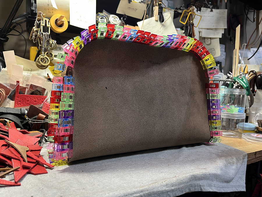 クロムエクセルを仕上げるときには必ずひっくり返すときにできるシワが残ります。 クロムエクセルという革は硬すぎない弾力のある革なのでプエブロレザーより楽にひっくり返せますが、気になるシワをどこまで付けないで仕上げられるかが気になるところ。 さぁどうするバッグのカタチ。