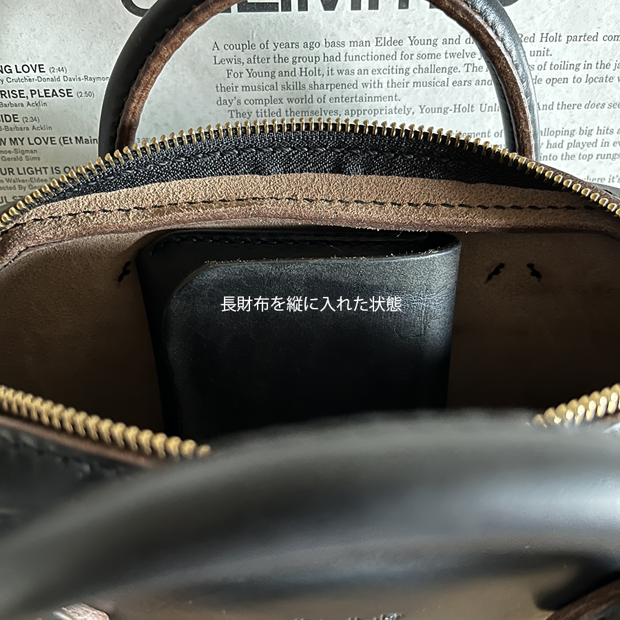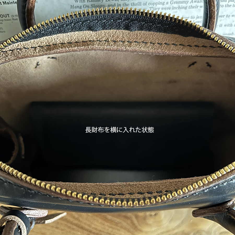 バッグのサイズをもう少し説明しますと長財布が縦に入る高さです。 もちろん横にもできます。