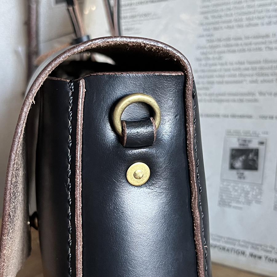 ショルダーベルトを取り付ける金具を真鍮製の小さな丸カンにしてみました。Dカンとは違う可愛らしい雰囲気が気に入ってます。