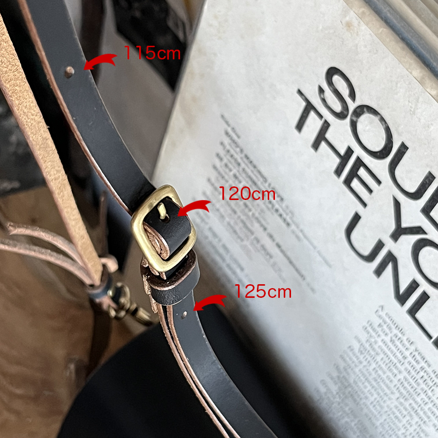 丸革から切り出したバッグと同じクロムエクセルレザーで作ってます。 丸革のカタチや大きさによりベルトの長さを切り出せる状況が変わります。 製作過程上、今回は115cm~125cmまでの3穴での調整可能な長さになります。 ベルト自体もバッグのサイズに合わせて細めになってます。 バッグルも真鍮製です。 全てがオリジナルです。