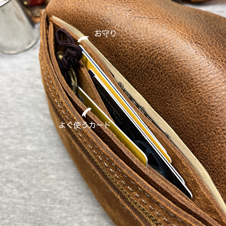 ⤵︎ そうは言っても「必ず寄るスーパーのカードだけは」みたいな、私の重要カードだけはココに。お守り入れてるんです僕。